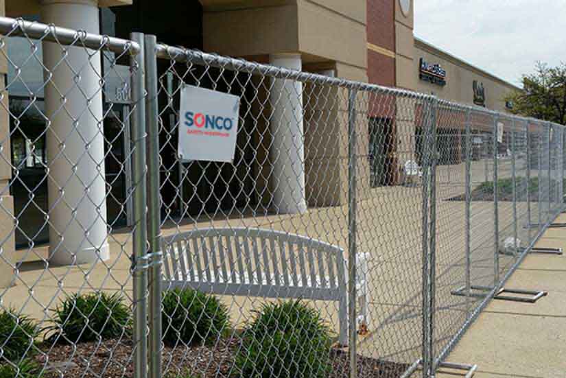 SONCO offers chain-link fence with gate designed for both vehicle and pedestrian access. All gates are compatible with this 6x10 temporary chain-link fence panel setup and support controlled entry points on construction and rental sites. See available fence gate options.
