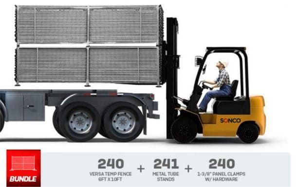 This truckload is priced per kit, with a minimum order of 240 kits. Each kit includes one fence panel, one metal tube stand, and one clamp.