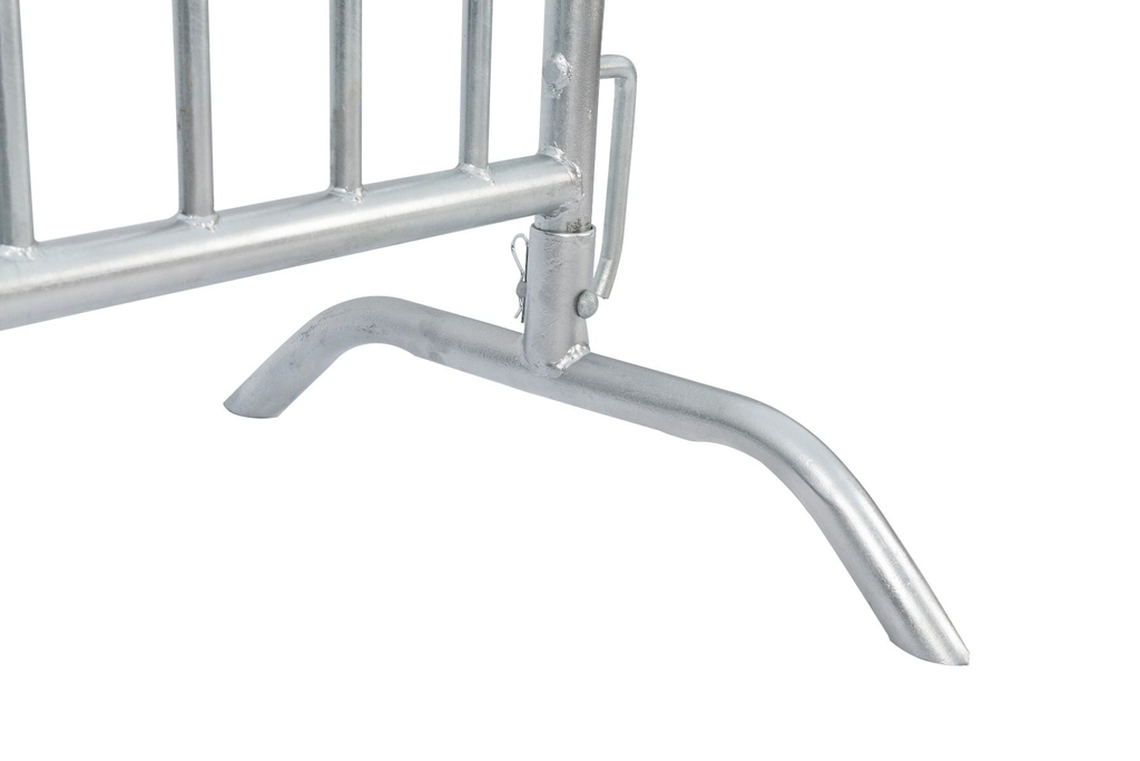 Bridge-style metal barricade feet, compatible with all SONCO barricades. Hot-dip galvanized for corrosion resistance. Each pair includes one foot with a higher bridge gap and one with a lower bridge gap.