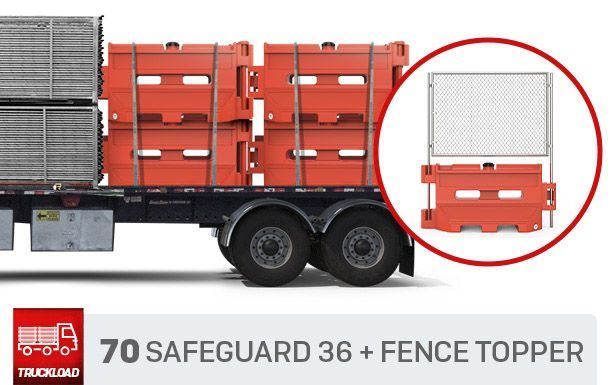 This truckload combines 70 units of the Safeguard 36 plastic jersey barriers with 70 fence toppers to create a modular separation solution for temporary traffic control, construction sites, event environments, and mixed-use areas.