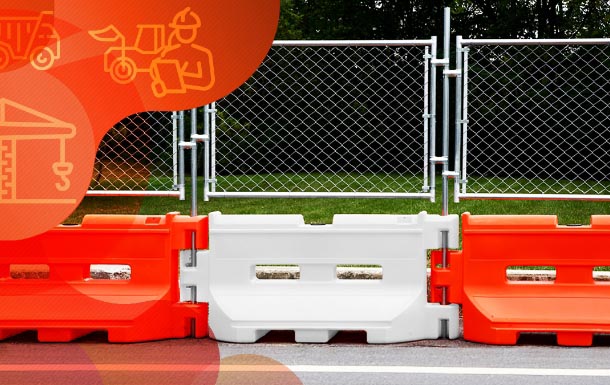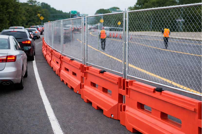 The water-filled barricade base provides stable ground-level channeling, while the fence topper increases vertical definition for clearer vehicle and pedestrian separation.